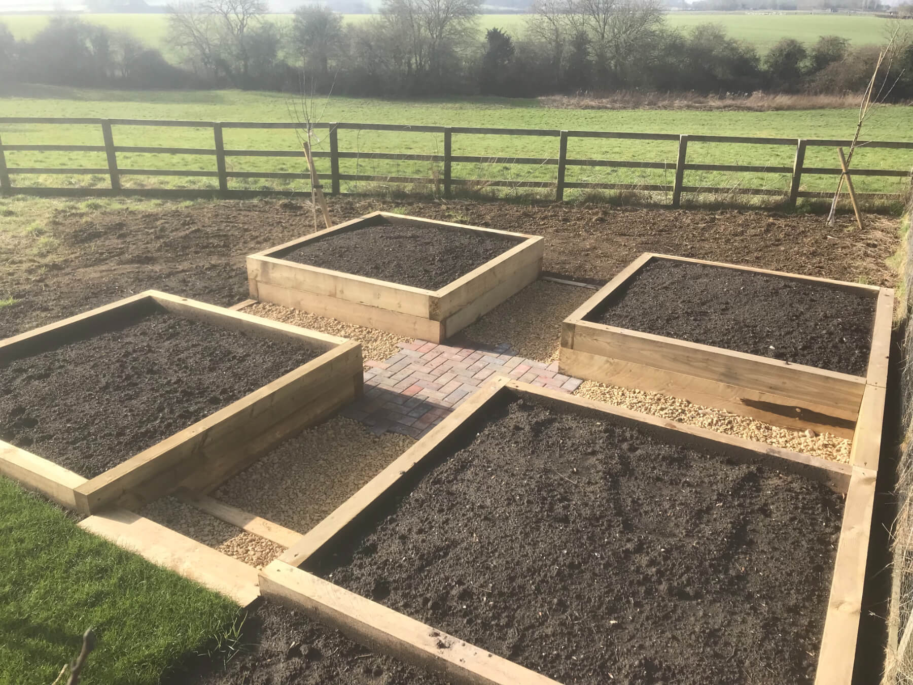 We crafted a set of square raised beds using sturdy, soft wood sleepers to create a natural aesthetic while ensuring durability. The spacious beds allow for growing a variety of fresh produce, promoting healthy growth with excellent drainage and easy access for planting and harvesting. We added the extra detail of Bradstone Driveway pavers to create some interest to complement the connecting gravel paths.