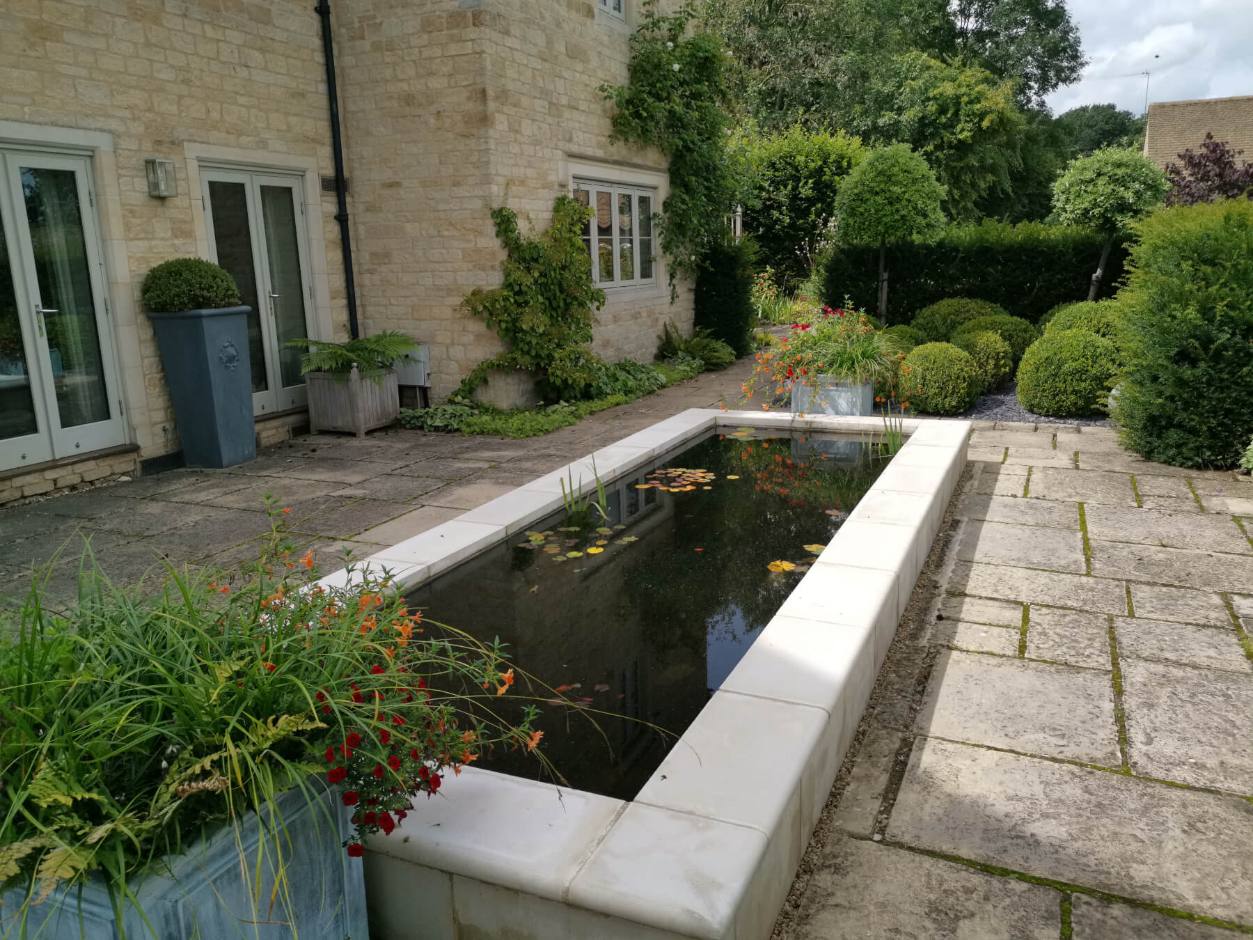 The bespoke pond with a white surround contains black water to create a dramatic and contemporary focal point in the landscape. We planted carefully selected vibrant green pond plants with brightly coloured blooms to contrast with the dark water. This unique design not only enhances the aesthetic appeal of the garden but also promotes a thriving ecosystem for aquatic life.